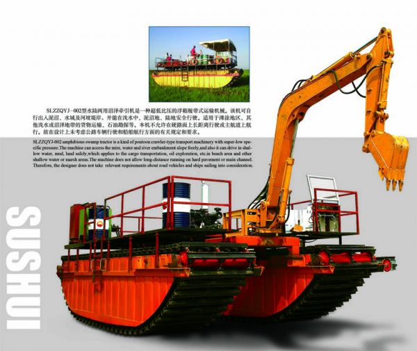 | SLZZQYJ-002型水陆两用沼泽牵引机是一种超低比压的浮箱履带式运输机械。该机可自行出入泥沼、水域及河坡堤岸,并能在浅水中、泥沼地、陆地安全行驶。适用于滩涂地区、其他浅水或沼泽地带的货物运输、石油勘探等。本机不允许在硬路面上长距离行驶或主航道上航行。故在设计上未考虑公路车辆行驶和船舶航行方面的有关规定和要求。 |